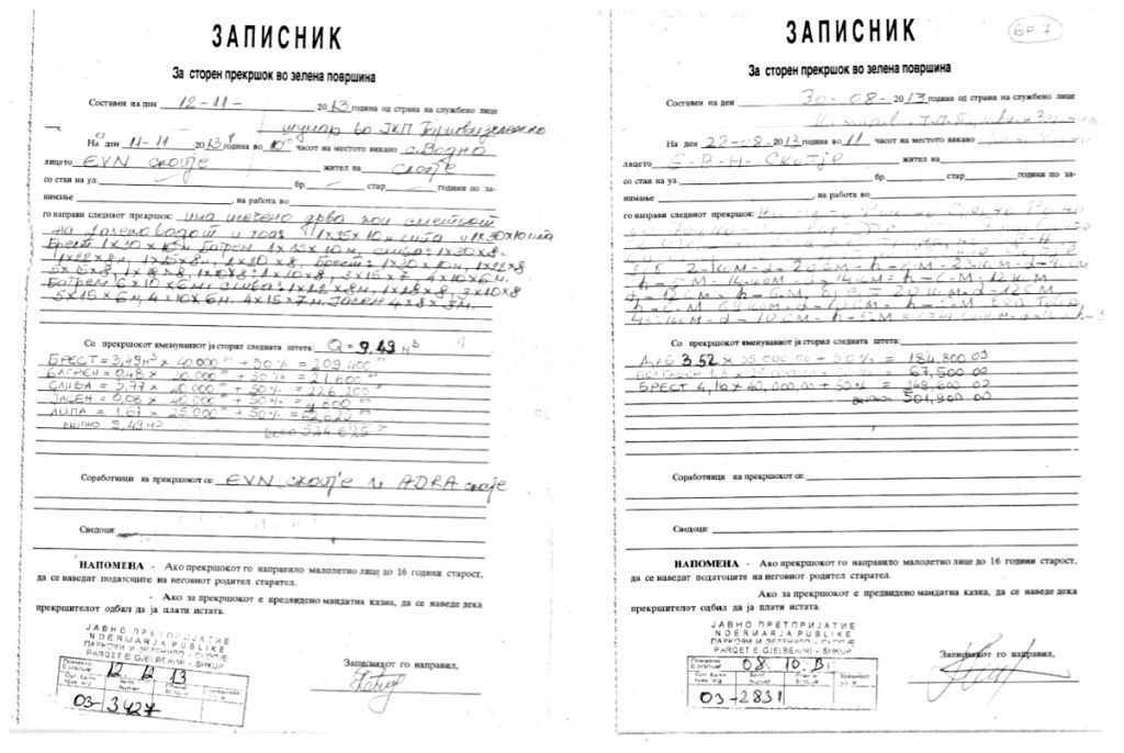Два записници за сторен прекршен во зелена површина за „Гранит“, напишани