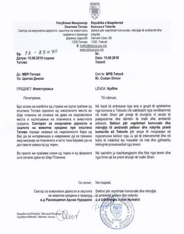 Градоначалничката на Тетово побара од МВР да го сопрат уништувањето на шумите на Шар Планина.