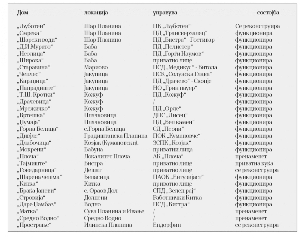 планинарски објекти, па потоа да се одлучи конкретно кои локации се најдобри за