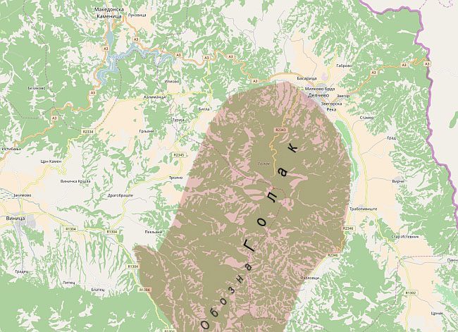 Планината генерално има меридијански правец на протегање, со должина на би­лото од 20 km, а просечна широчина од 10-12 km. Највисок врв на Голак е врвот Чавка (1538 m), а на Обозна врвот Јастреб (1273 m). Врвот Чавка е доста доминантен и од него се протега одличен видик кон целиот овој простор и кон територијата на Бугарија. Близу до него е врвот Св.Пантелејмон (1508 m), каде се наоѓа истоимената впечатлива црквичка. Тоа се единствените врвови над 1500 m, а покрај нив има уште 4 врва над 1400 m. Планината Голак, административно припаѓа на две општини: поголемиот, источен дел на општината Делчево, а помалиот западен дел на општина Виница. Еден сосема мал сегмент од планината (т.е. од огранокот Обозна), над с. Митрашинци, административно припаѓа на општина Берово.