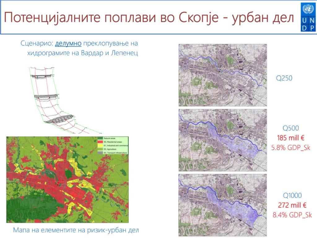 „Доколку настане делумно преклопување на брановите, тогаш градот може да очекува штета од безмалку 200 милиона евра, или 5-6% од БДП. Но, ако настане катастрофален бран, тогаш штетата достигнува до 300 милиони евра, односно 8-9% од БДП на Град Скопје“, нагласува тој.