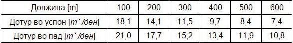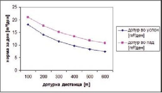 Во графиконот 2 е даден графички приказ за зависност на нормата за дотур на трупци со трактор во пад и успон во зависност од дотурната дистанца. Од графиконот се гледа дека нормата опаѓа со зголемување на дотурната дистанца.
